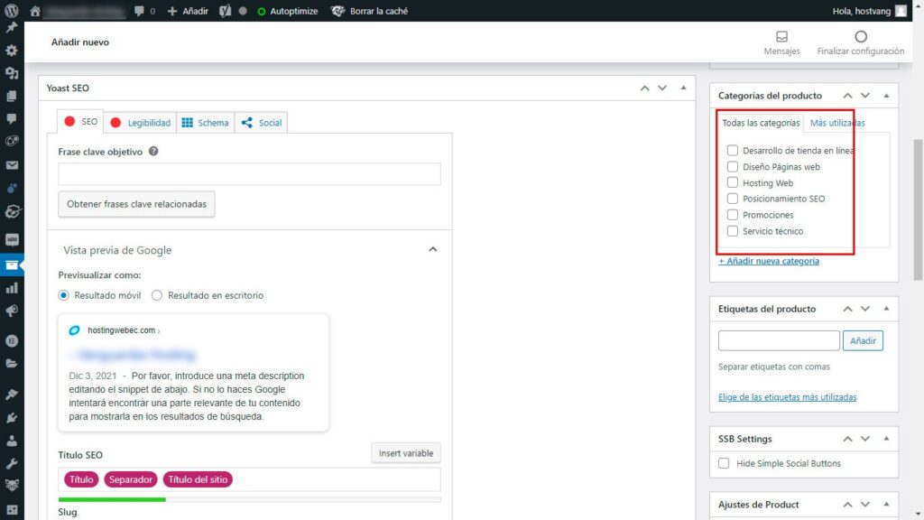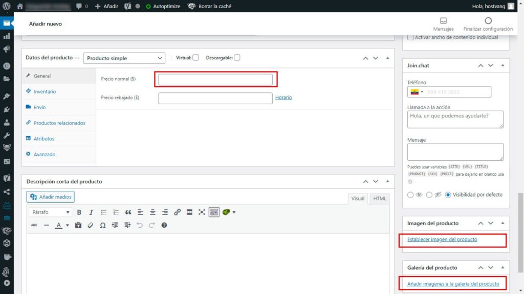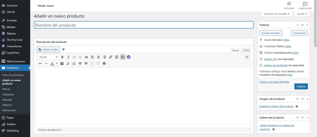 4.- Para crear un nuevo producto se debe agregar ir al link “Añadir nueva”, una vez que damos clik en “Añadir nueva”, se abre una pantalla así: