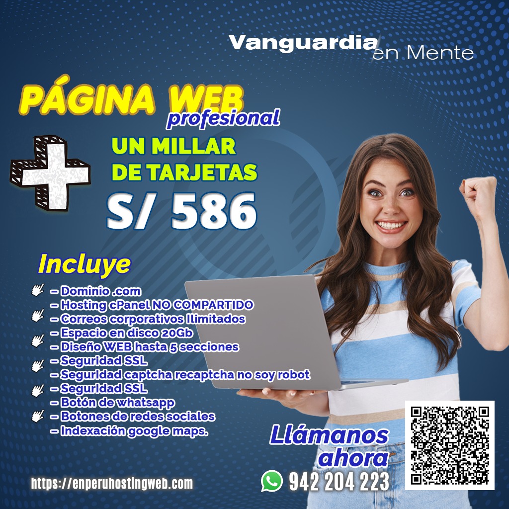 Diseño de página web, incluye dominio .com, hosting cPanel, Correos electrónicos corporativos, Espacio en disco 8Gb, Diseño web 4 secciones, seguridad SSL, seguridad captcha recaptcha, botón de whatsapp, botones de redes sociales, ubicación google maps.